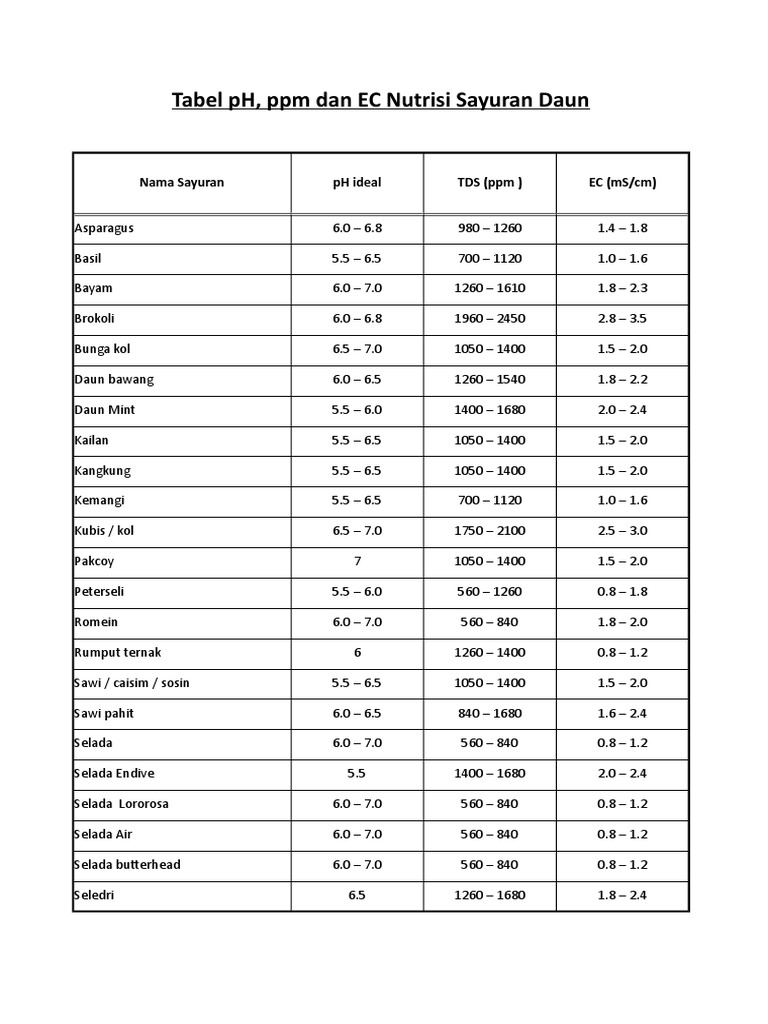 Hidroponik Tabel Ph Ppm Dan Ec Nutrisi Sayuran Daun